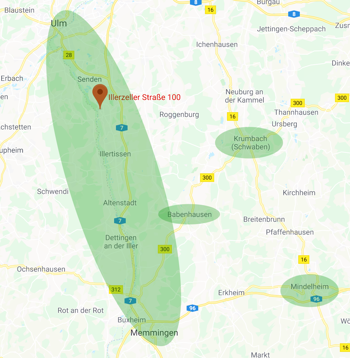 - Abhol-/Lieferservice in den mit grün markierten Regionen für lediglich 5€ zzgl.